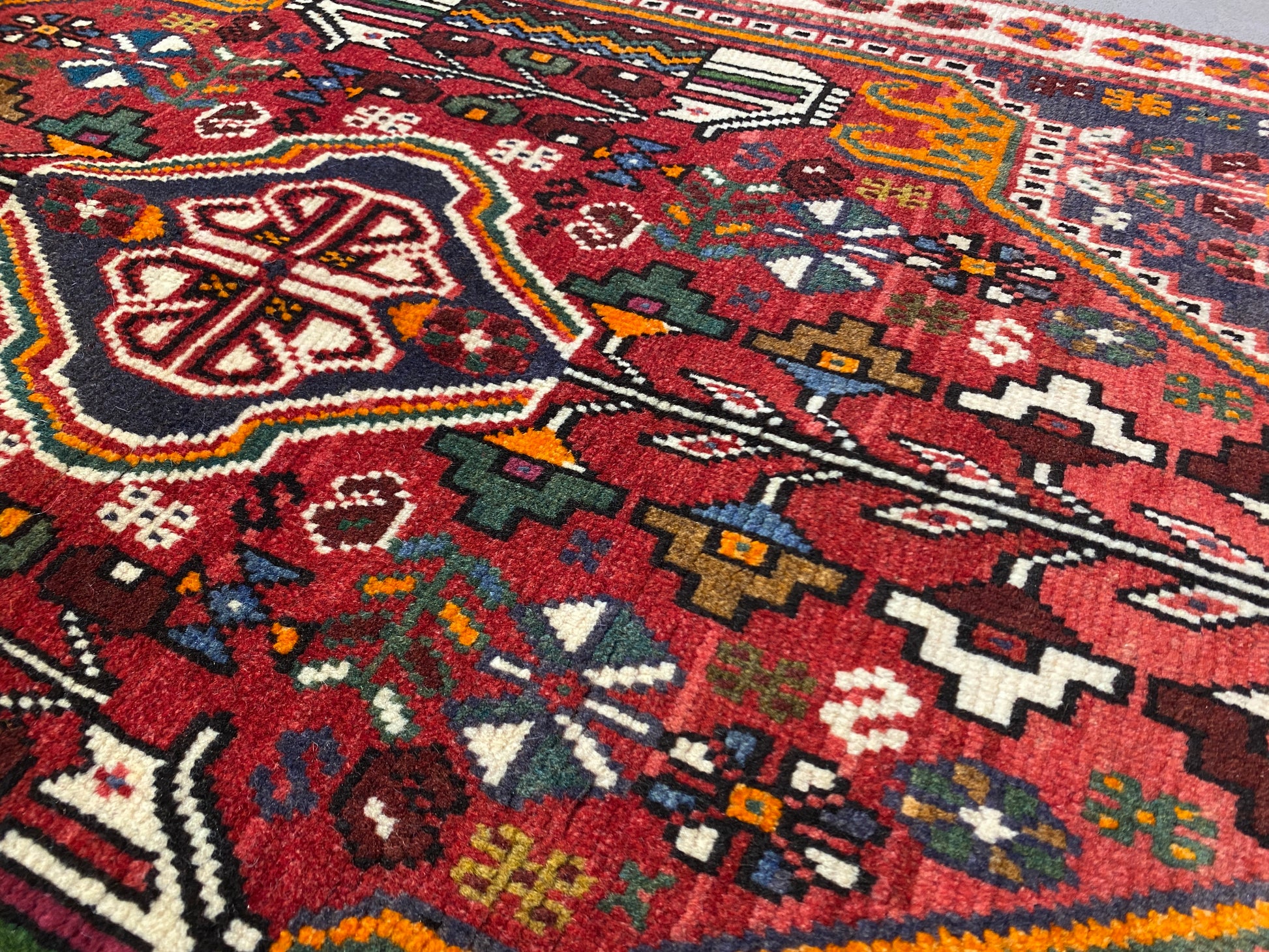 シラーズと呼ばれるトライバルラグは、他の産地部族と比べると比較的ざっくりとした織りで厚みがあり、クールなデザインからユニークな動物モチーフまで幅広いバリエーションが楽しい産地です。 Lead more [close]