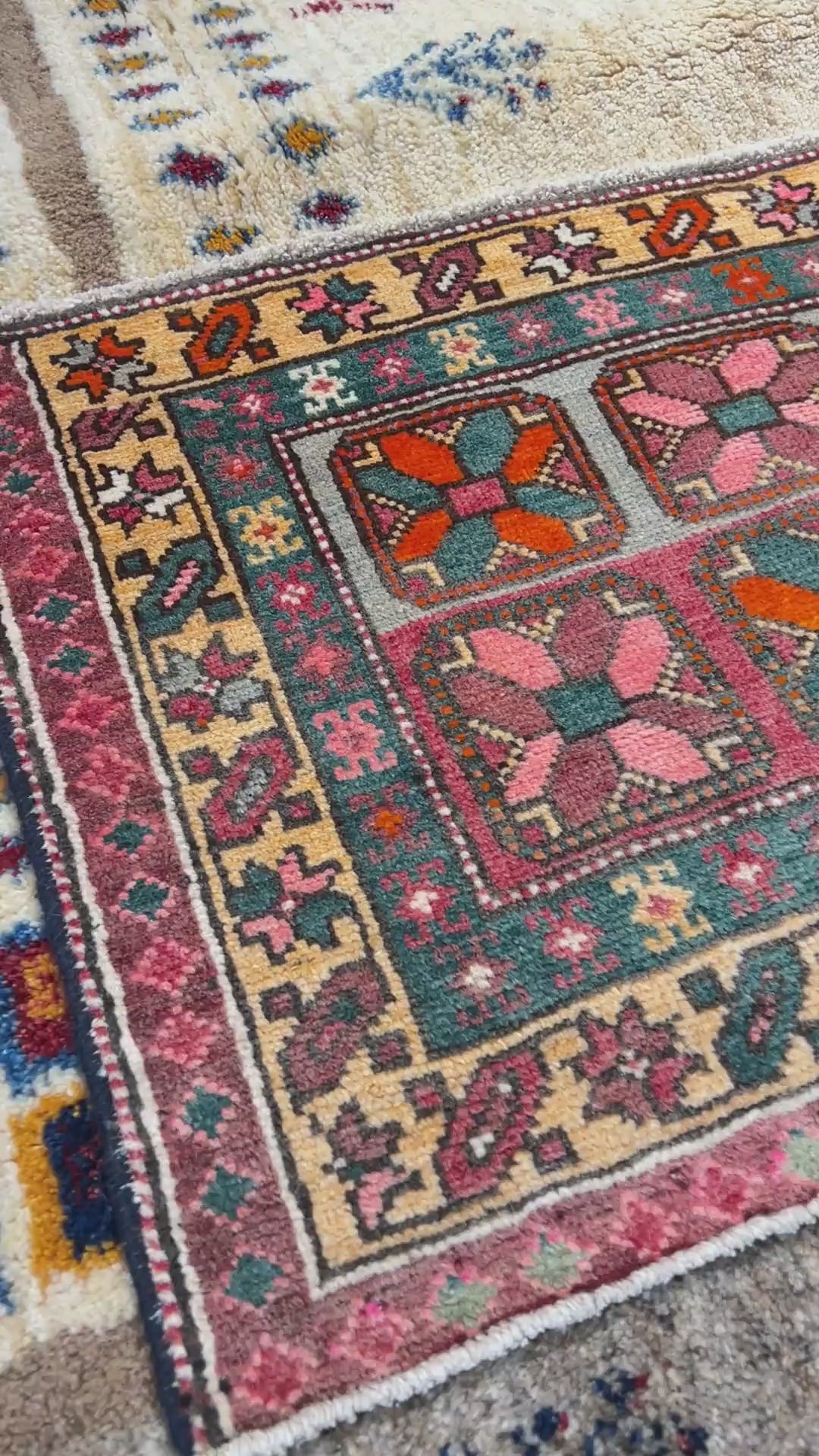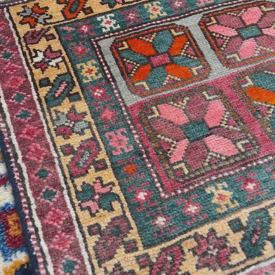 メシキンのポップで華やかなアクセントサイズのヴィンテージラグ。